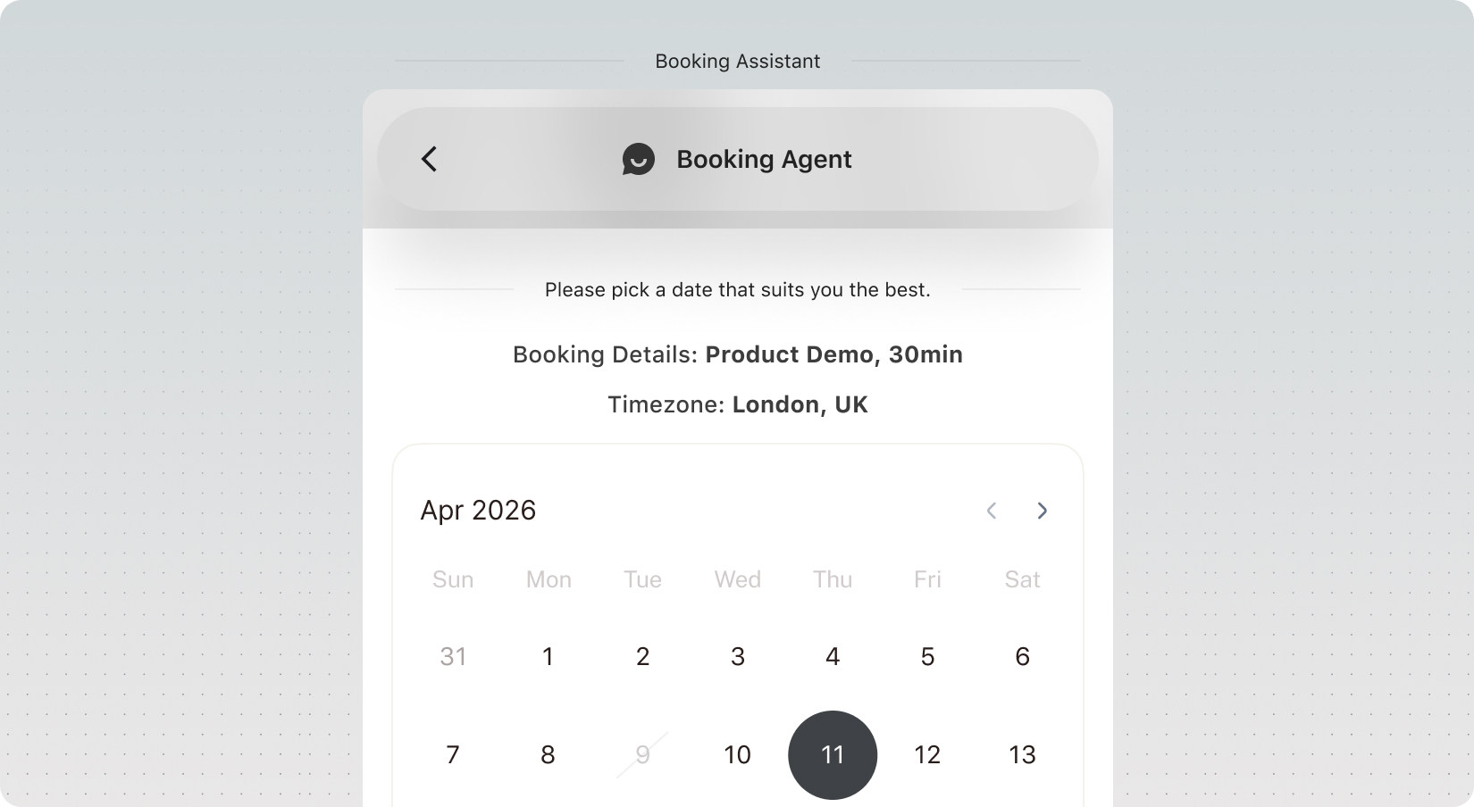 Cuando la configuración esté completa, tu agente podrá mostrar el flujo de reserva dentro del chat usando el embed de Calendly o Cal.com.