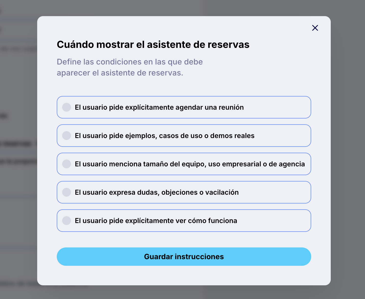 Puedes ajustar las condiciones en las que el agente debe mostrar esta experiencia, por ejemplo cuando el usuario pide agendar una reunión, ver una demo o avanzar a una llamada.