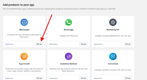 1- Desde el dashboard de tu app, busca Add Products → Messenger.