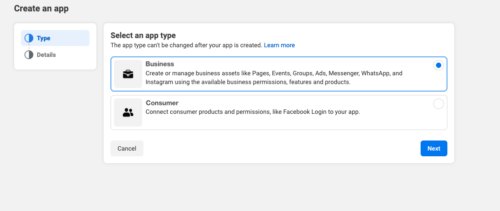 3. En el tipo de aplicación, elige Business y completa los datos requeridos.
