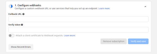 1. En la configuración de la app, navega a Messenger → Settings → Webhooks.