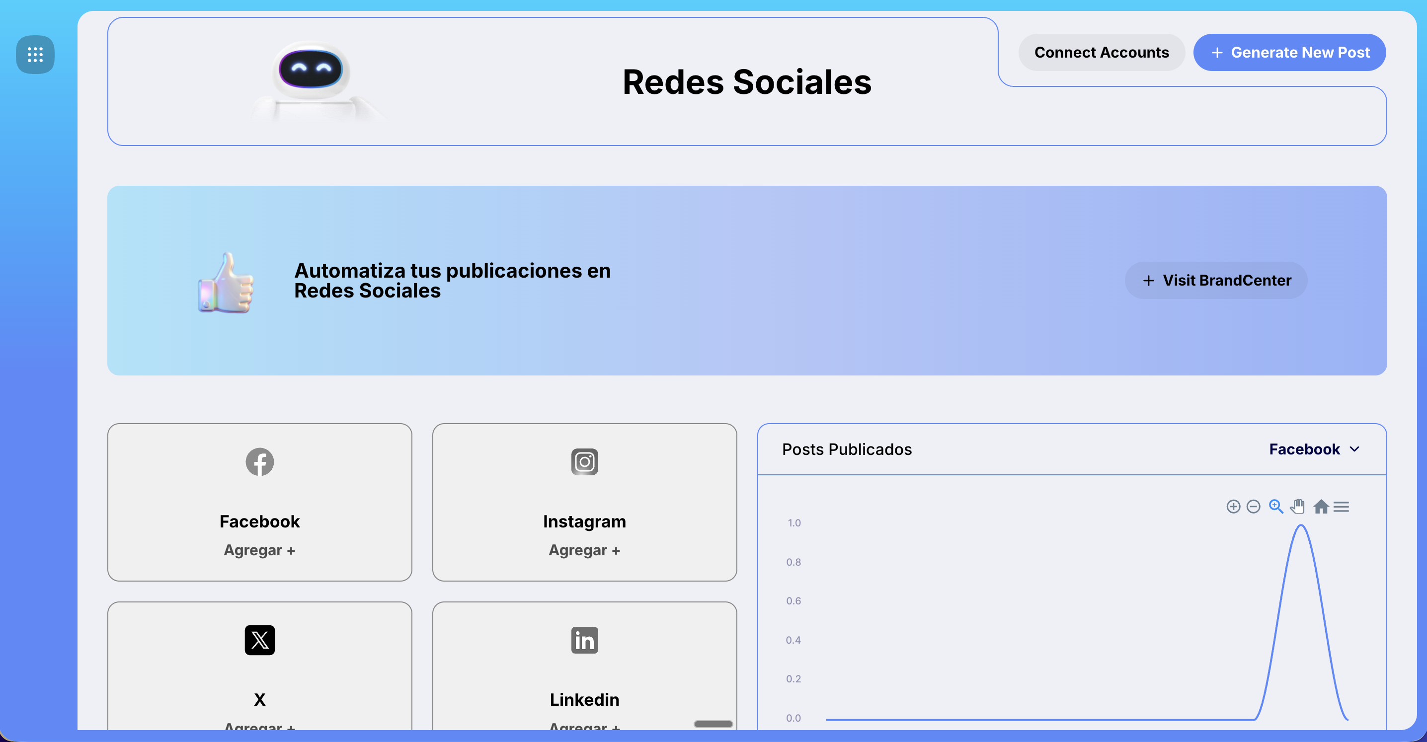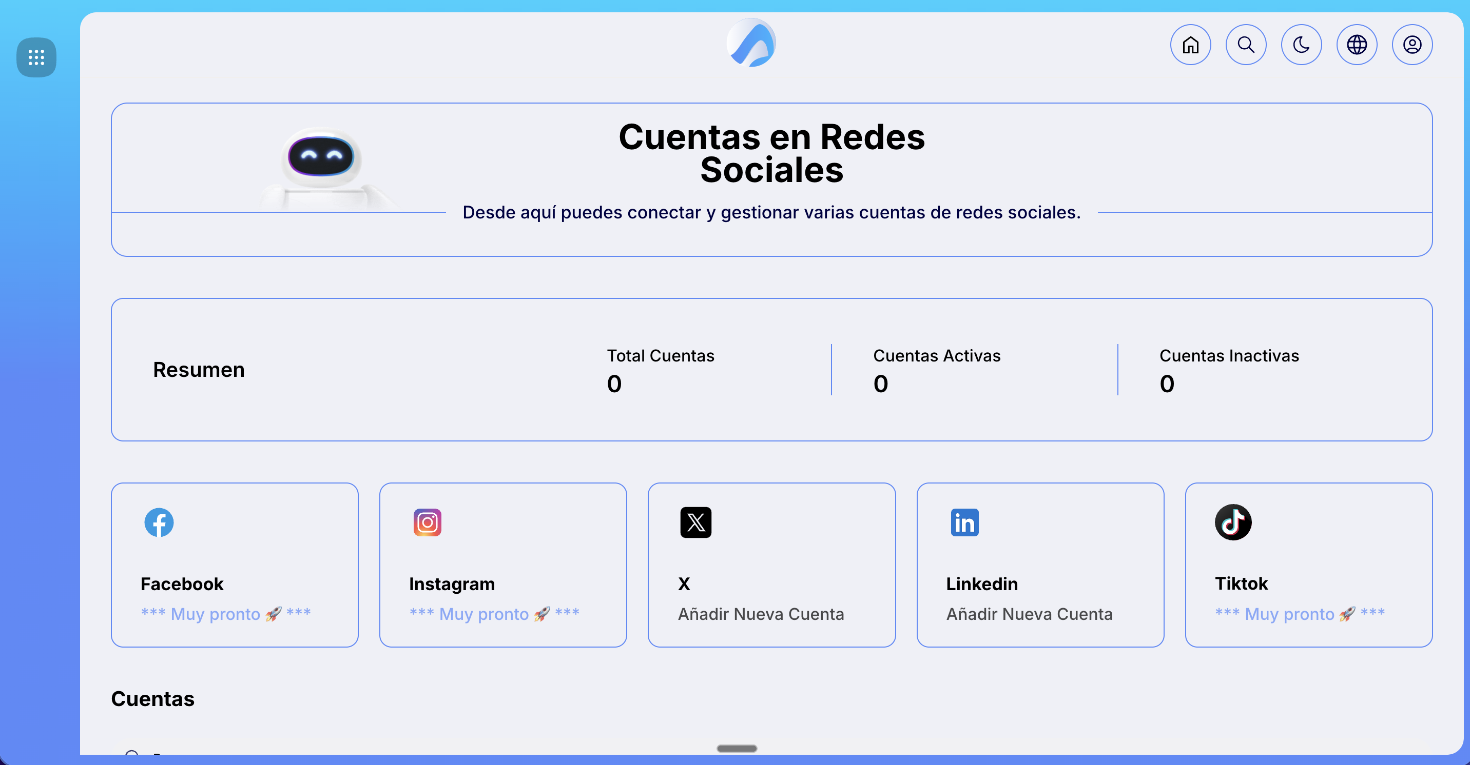 - Conectar y gestionar varias cuentas de redes sociales (actualmente compatibles con X y LinkedIn; integraciones con Facebook, Instagram y TikTok se incorporarán más adelante).