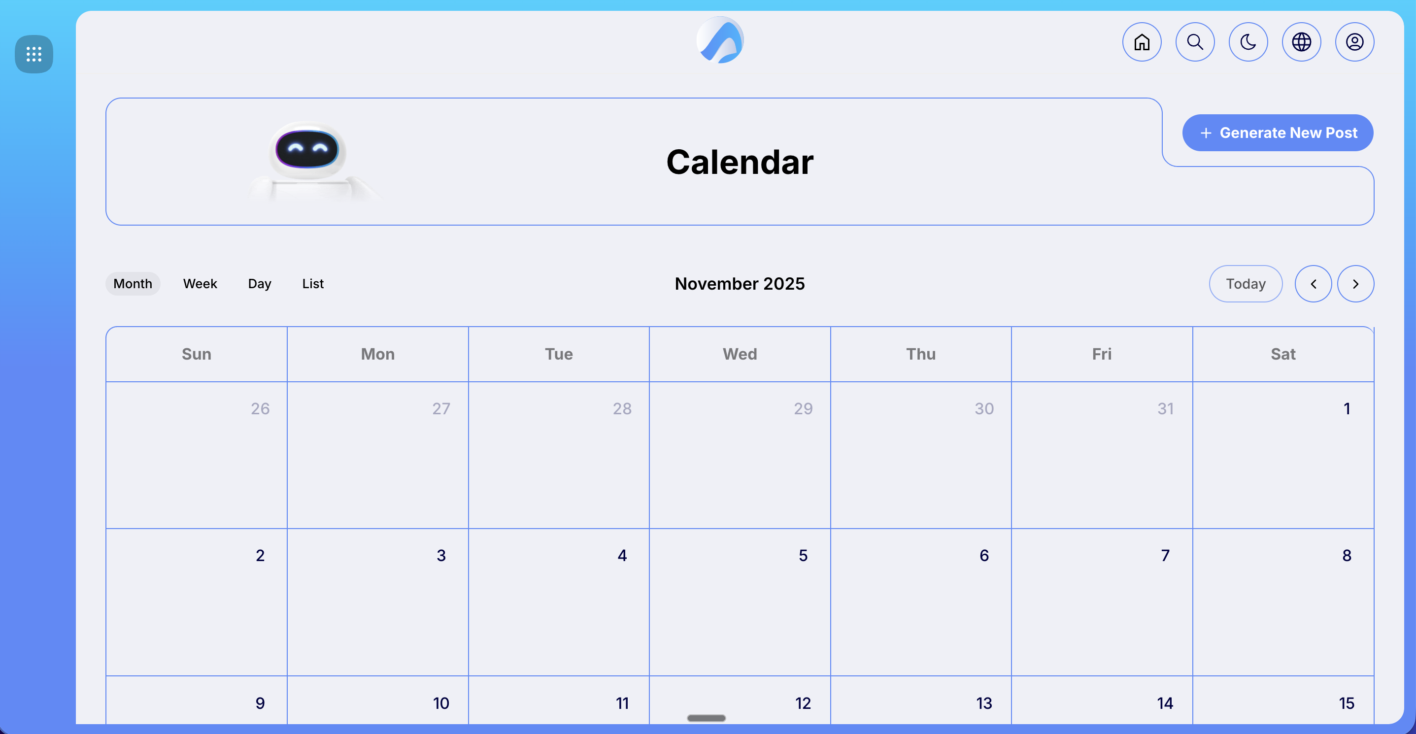 - Crear posts personalizados con ayuda de IA, seleccionando tono, contenido y hasta imágenes generadas automáticamente.